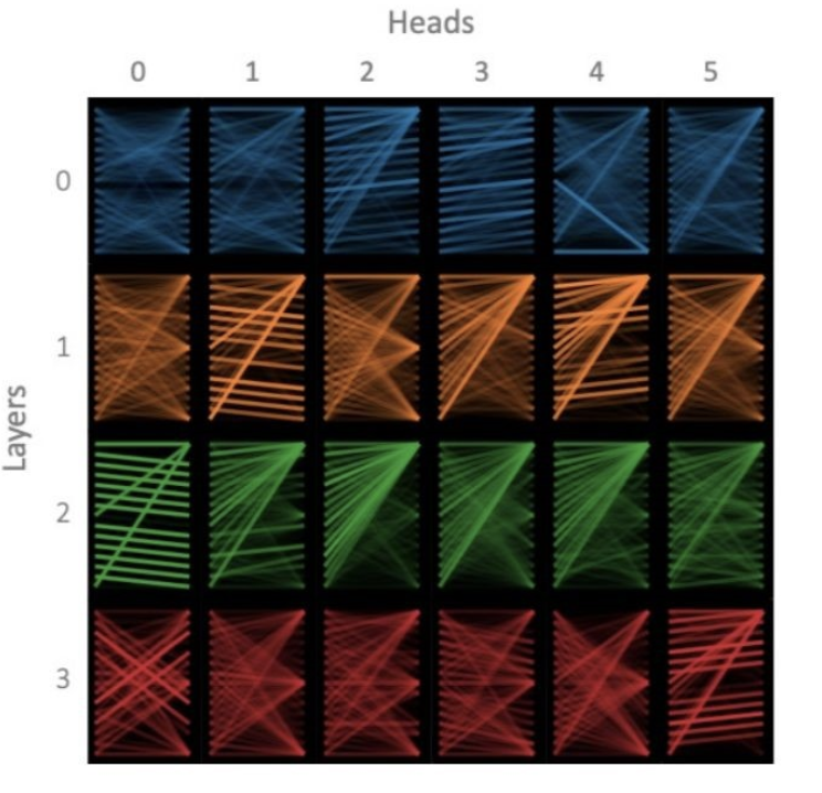 图6 Bert的0-3层中,第0-5的head对于同样的输入所关注的内容。