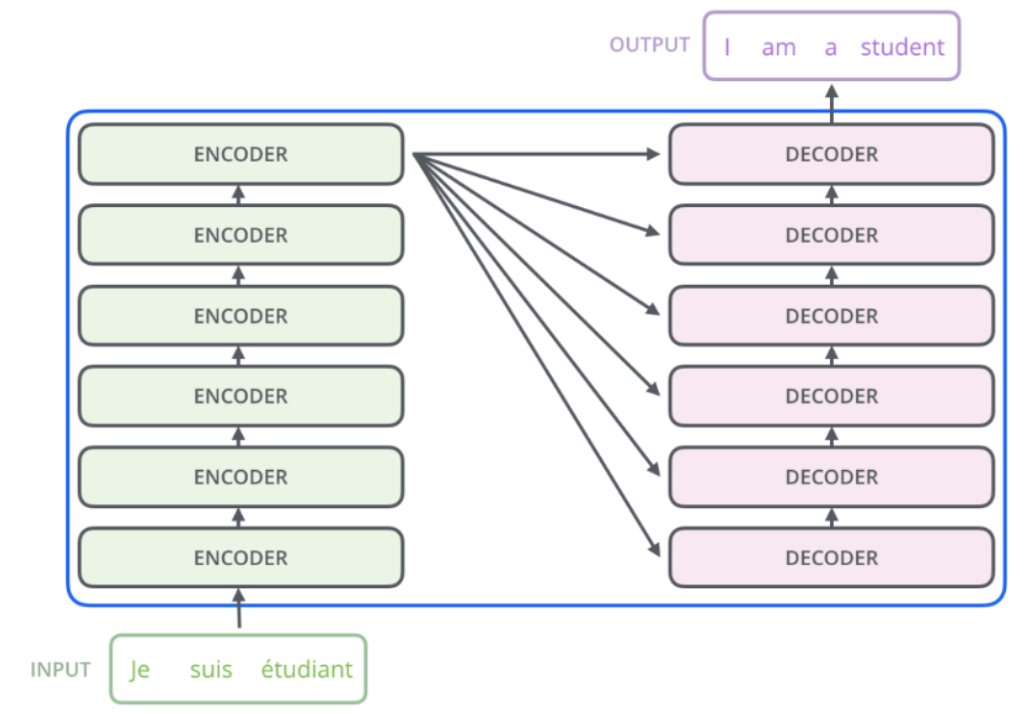Transformer的基本构架如下图所示,其中,左半边是Encoder部分,右半边是Decoder部分。Transformer有6层这样的结构。