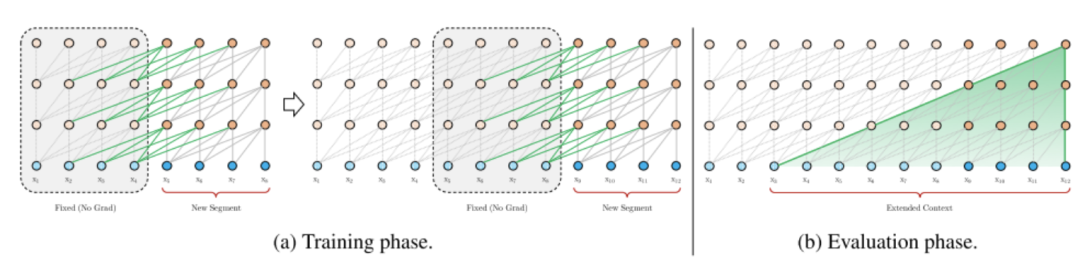 用一句话概括Segment-level Recurrence,那就是,在对当前segment进行处理的时候,缓存并利用上一个segment中所有layer的隐向量,而且上一个segment的所有隐向量只参与前向计算,不再进行反向传播。