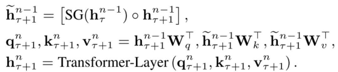 让我们仔细深入研究一下计算过程,假设每个segment的长度为L,整个模型包含N层Transformer-XL,那么每组segment就包含有N组长度为L的隐变量数组。将第t组segment的第n层隐变量向量表示为 ,其大小为 ,d是隐变量向量长度,那么第t+1个segment的第n层隐变量向量可以由如下公式算出,其中SG指的是stop-gradient,即不对上一个segment的隐变量进行反向传播。