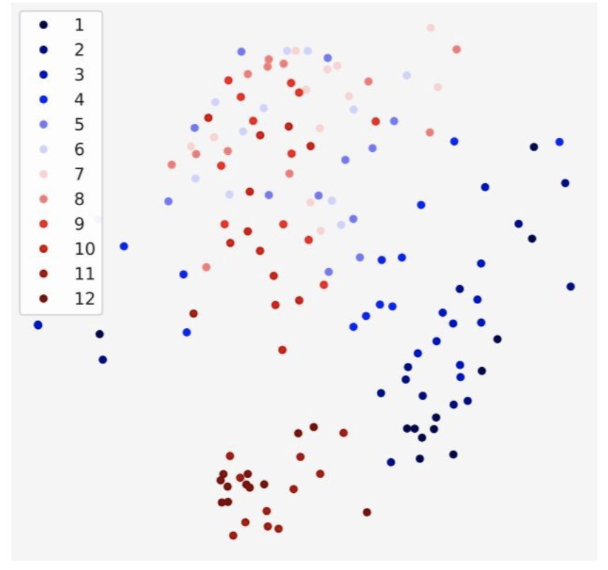 图7 对于Bert中,每一层的head之间的差异在二维平面上的投影