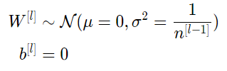 层l中的所有权重均自正态分布中随机挑选,其中均值 μ=0 ,方差E= 1/( n[l−1]),其中n[l−1] 是第l-1层网络中的神经元数量。偏差已初始化为零。