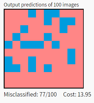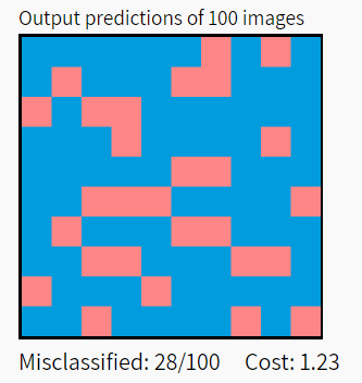 下图说明了Xavier初始化对五层全连接神经网络的影响。数据集为MNIST中选取的10000个手写数字,分类结果的红色方框表示错误分类,蓝色表示正确分类。