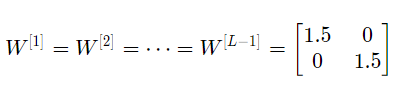 类似地,如果每个权重的初始化值都比单位矩阵稍小,即: