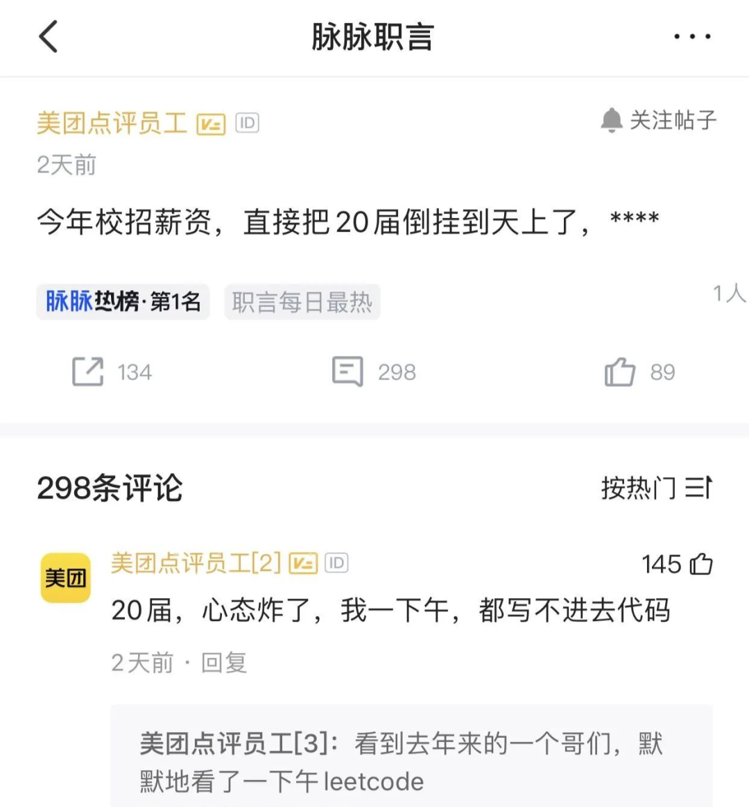 消息传出后,“网传美团今年应届生年薪 35w+,严重倒挂老员工,为什么互联网大厂校招的薪资一年比一年高?”话题迅速登上知乎热搜,引发激烈讨论,有美团内部人员看到消息后留言表示自己“写不进去代码了”。