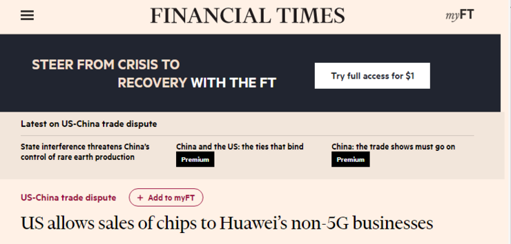 10 月 29 日,据金融时报报道,美国官方已经改口,只要不将芯片用于华为 5G 业务,将允许越来越多的芯片公司向华为提供组件。该报道援引一位参与其中的半导体企业高管话语称,“美国商务部在最近的谈话中一直告诉企业,尽管对华为的供应许可证是以拒绝为目的,但如果你可以证明你的技术不支持 5G,这一点可以被克服。”