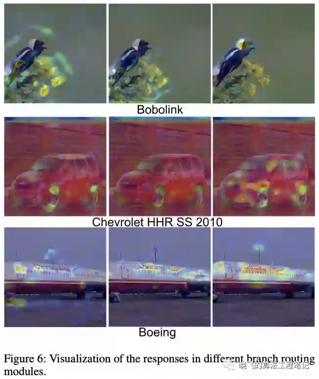 论文发现不同的分支路由模块关注的特征区域也不一样,图6的可视化结果分别为图2的R1、R2和R3节点使用Grad-CAM得到的响应区域