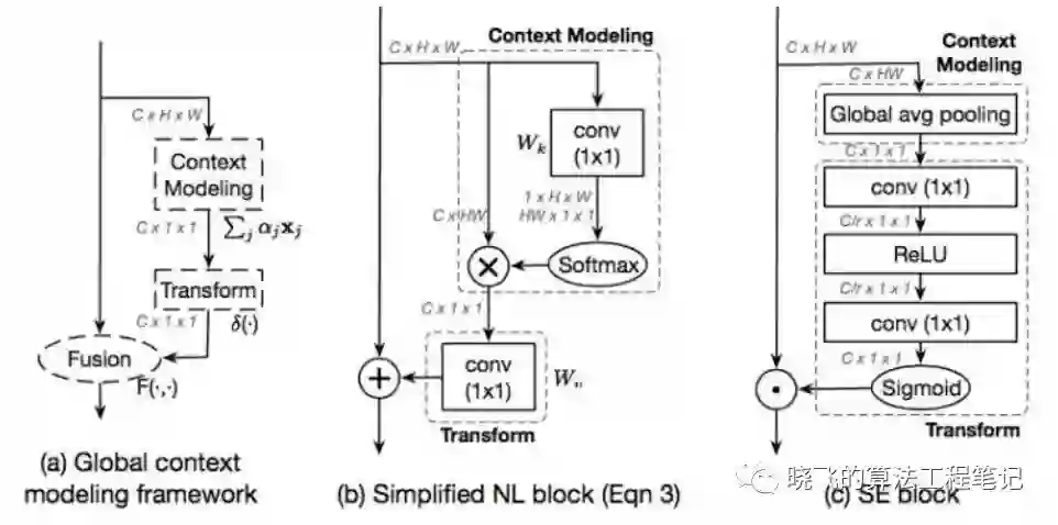 global context block的大概结构如上图a所示,来自GCNet的论文中。在context modeling和fusion步骤使用了simplified NL block,在transform步骤使用了SE block,这个模块能够很好地结合上下文信息来提取特征,最后使用global average pooling、element-wise square-root、L2正则化以及sigmoid激活的全连接层输出标量