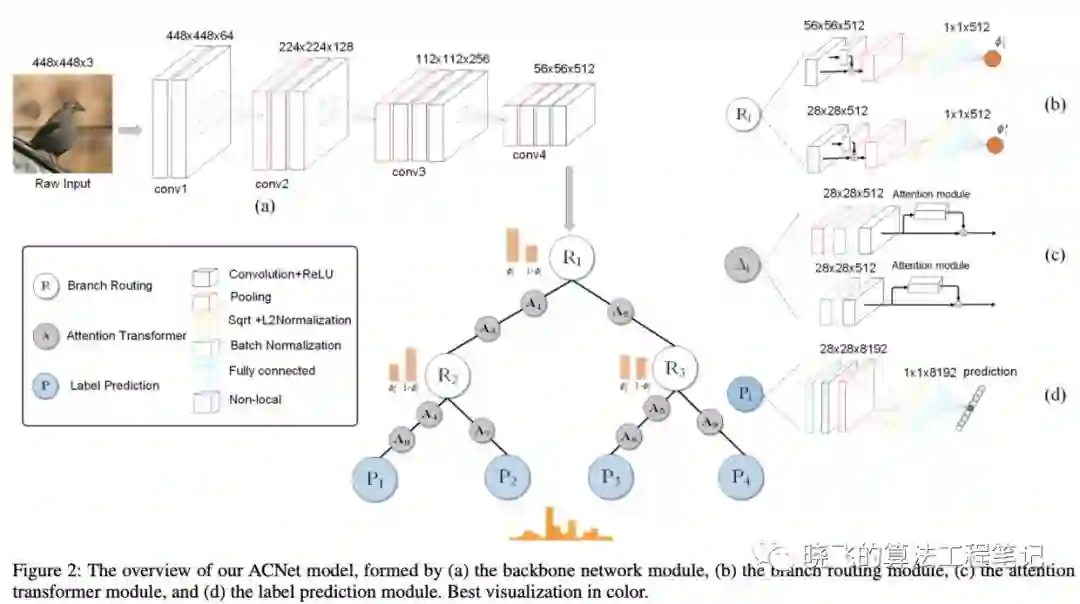 对于ACNet的每个叶子节点,用标签预测模块 来预测目标 的类别, 为目标 从根节点到k层第i个节点的累计概率,预测模块由 卷积层、max pooling层、L2归一化层、全连接层和softmax层组成,通过求和所有的叶子节点的预测结果和路径累计概率的乘积得到最终的预测
