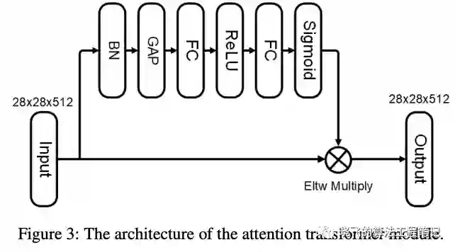 Attention transformer模块用于加强网络获取关键特征的能力,在 卷积后面插入结构如图2c所示的attention模块,该模块的旁路输出一个大小为 的channel attention map对输入特征进行加权