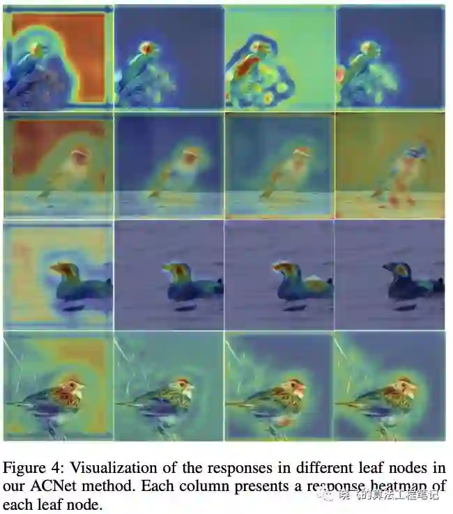 如图5所示,使用树状结构能够显著提升准确率,使用Grad-CAM产生heatmap来对叶子节点对应的响应区域进行可视化,发现不同的叶子节点关注的特征区域各不一样