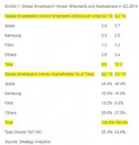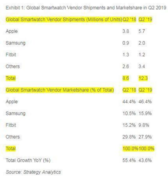 市场调研机构 Strategy Analytics 发布的 2019 Q2 报告显示,全球智能手表出货量中,苹果 46% 份额遥遥领先,第二三位分别是三星和Fitbit,三者垄断超 72% 的市场份额。