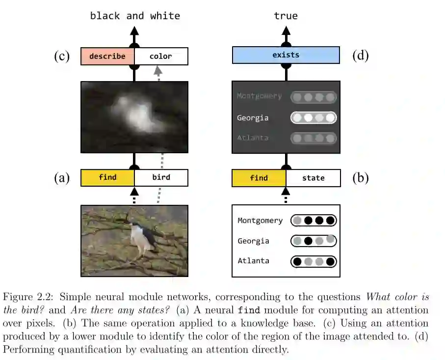 在解决实际问题时,首先对问题进行分解,然后再动态选择子模块解决问题。如左侧问题: 图片中的鸟是什么颜色? 首先调用Find模块,通过注意力机制,找到图中的鸟的位置,然后然后调用describe模块,对鸟的颜色进行描述。右侧问题:知识库中是否存在任何州?同样也是先调用Find模块,高亮出Georgia州,然后调用存在模块,判断是否是州。