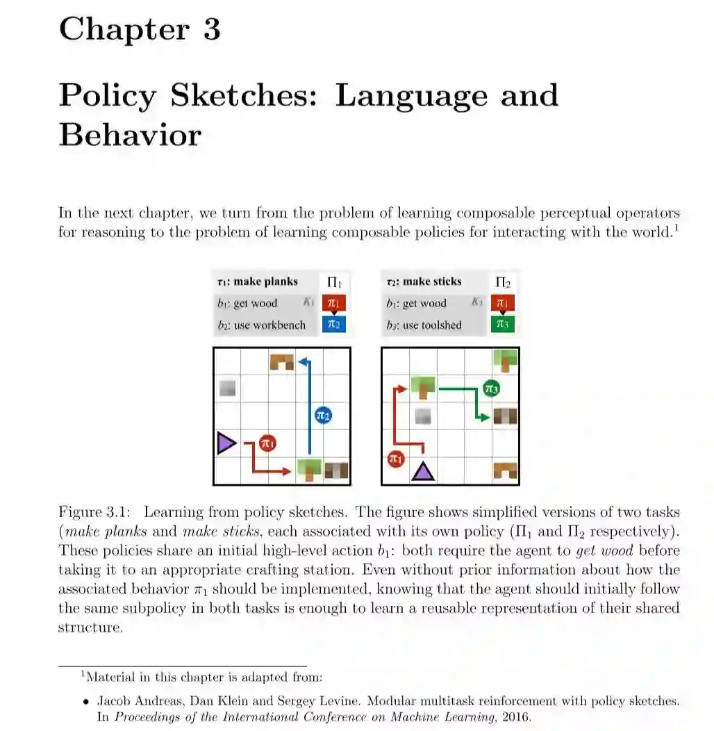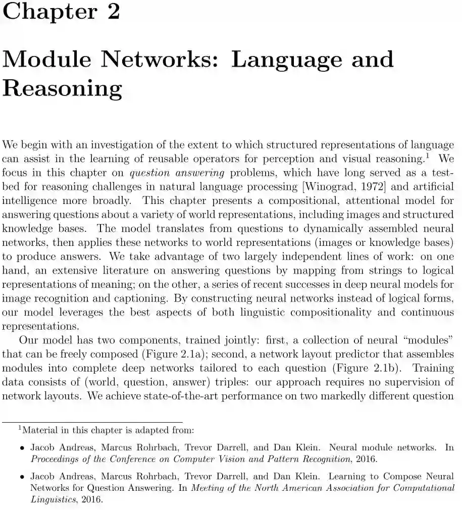 作者首先介绍一类称为神经模块网络(NMN)的模型,并介绍它们在自然语言问答中的应用。NMN旨在实现同时利用深层网络的表征能力和构成问题的语言结构。我们的方法将问题分解为语言子结构,并使用这些子结构动态地从可重复使用的模块库构建网络。由此产生的复合网络是共同训练的。作者并在含有图像和结构化知识库的问答数据集上的方法评估模型。随后,作者将这种思想转移到策略学习中,研究在面对不同但相似的问题时,怎么组合策略。