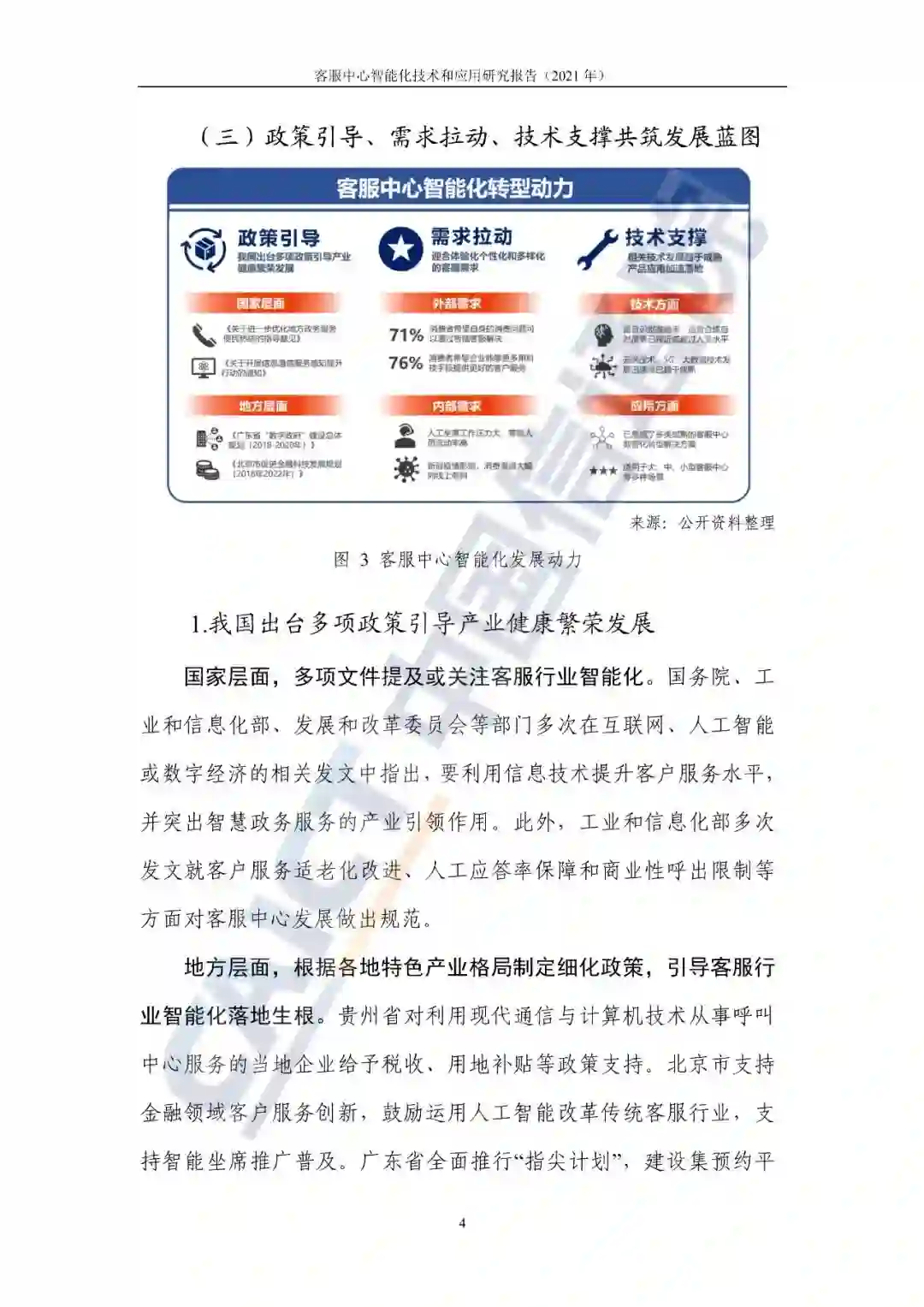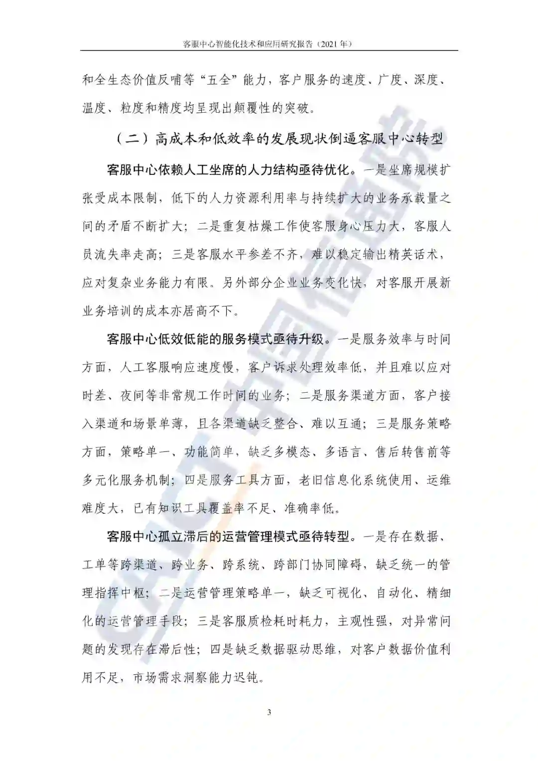 近年来,客服中心在政策引导、需求拉动和技术支撑方面均迎来重要发展机遇。政策方面,《关于推进"上云用数赋智"行动培育新经济发展实施方案》等多项政策文件指出,要加速推进企业数字化进程,客服中心作为服务企业内外的关键部门将率先获得转型红利。需求方面,客户期望服务质量提升和企业寻求降本增效分别构成了客服中心智能化的外部需求和内部需求。技术方面,人工智能和5G等技术的日益成熟,为客服中心的职能转化、形态转变、产品转型、场景转换和服务转优提供了坚实的基础支撑。