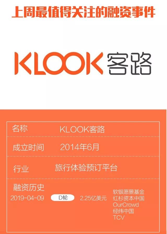 上周最值得关注的项目是KLOOK 客路旅行获得2.25亿美金融资,KLOOK 客路旅行成立于2014年,主要为旅行者提供便捷的“自由行玩乐预订服务”,包括全球 270 个目的地的热门景点门票、一日行程、特色体验、当地交通及 WiFi、美食餐饮等共计超过 10 万种当地行程与旅游服务,公司目前有超过 1000 名团队成员遍布全球 20 个办公室,支持 9 种语言、41 种货币支付。