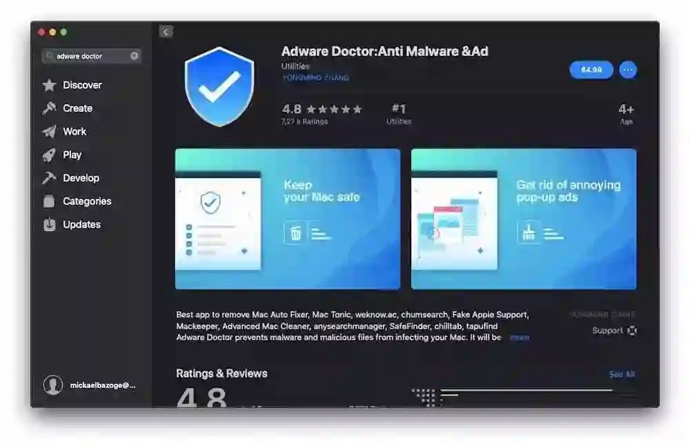 保障 Mac 使用安全和摆脱烦人的弹出式广告,在下载和评论排行中,Adware Doctor 仅次于广受欢迎的生产力 App Notability 和苹果自家的 Final Cut Pro 等。
