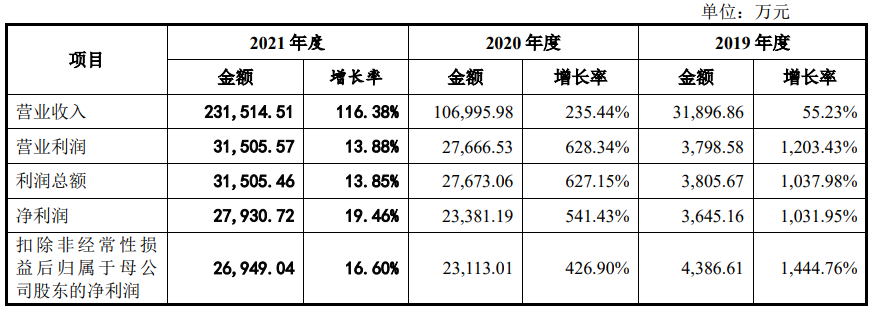 也正是切换赛道这一果断决策,让华宝新能源在招股书上交出了一份还算好看的成绩。据招股书显示,从2019年至2021年,华宝新能源的营业收入分别为3.19亿元、10.70亿元和23.15亿元,同比增长235.44%、116.38%。对应净利润为0.36亿元、2.34亿元、2.79亿元,同比增长541.43%、19.46%。
