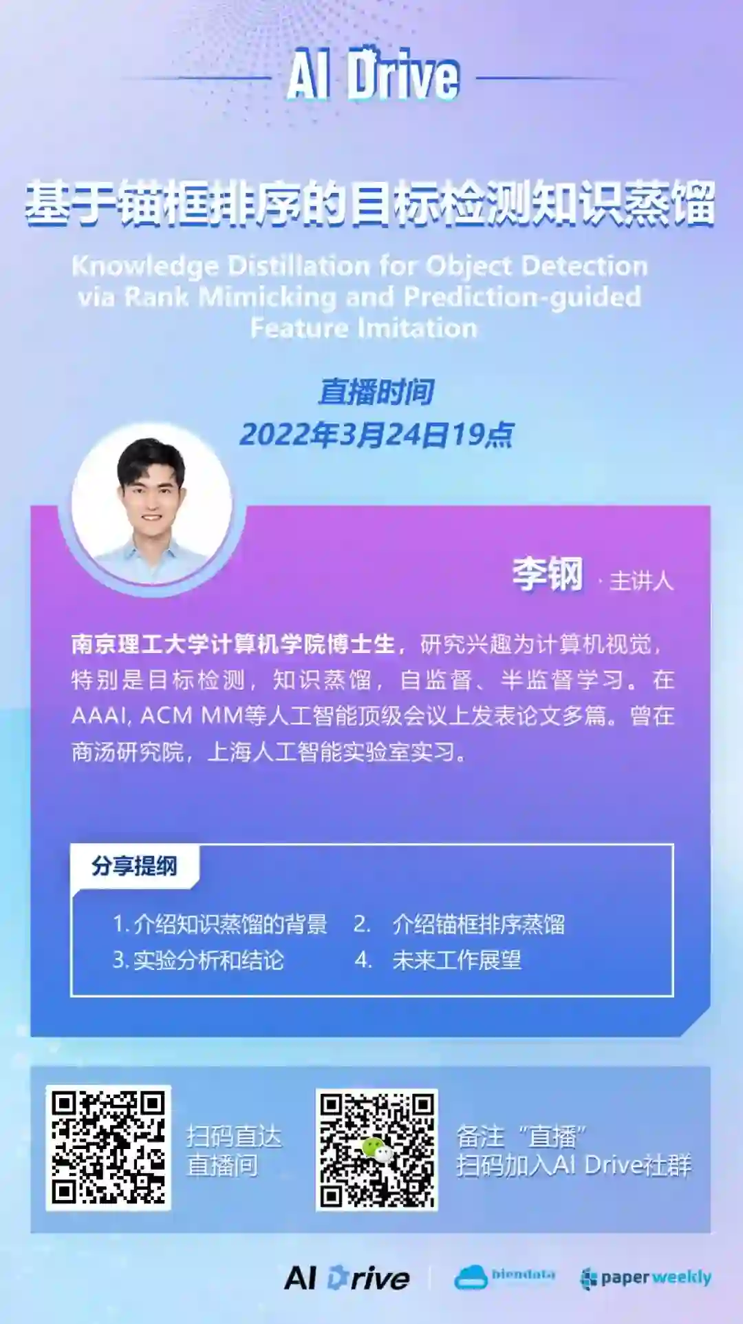 本期 AI Drive,我们邀请到南京理工大学计算机学院博士生李钢,为大家在线解读其发表在 AAAI 2022 的最新研究成果:Knowledge Distillation for Object Detection via Rank Mimicking and Prediction-guided Feature Imitation。对本期主题感兴趣的小伙伴,3 月 24 日(本周四)晚 7 点,我们准时相约 PaperWeekly 直播间。