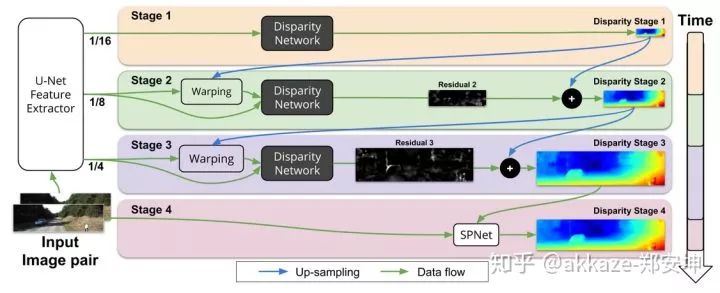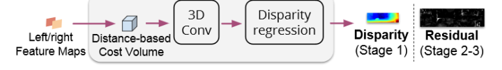 多级预测,最深层次预测一个粗视差,然后不断预测residual,disparity网络的主体是3d卷积