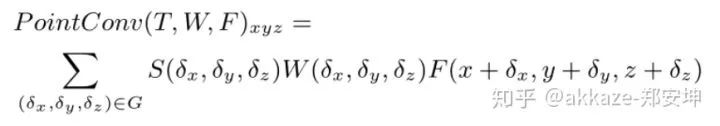 其中,W 和 F 均为连续函数,(x,y,z)(x,y,z) 是 3D 参考点的坐标,(δx,δy,δz)(δx,δy,δz) 表示邻域 G 中的 3D 点的相对坐标。上式可以离散化到一个离散的 3D 点云上。同时,考虑到 3D 点云可能来自于一个不均匀采样函数,为了补偿不均匀采样,使用逆密度对学到的权重进行加权。PointConv 可以由下式表示,