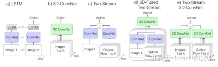 视频理解的常用架构,分为lstm,单流和双流,其中双流使用稠密光流作为一支输入