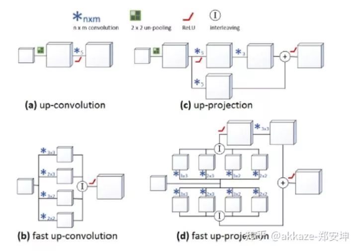 更快版本的upconv和upproj,具体来说就是用四个小卷积核,分别是3x3,2x3,3x2和2x2来代替大卷积核,然后用interleaving来代替unpooling