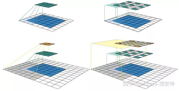 几种不同的上采样:(a)先用upsamling或者unpooling然后接两个conv,并使用跳转连接,(b)使用upsampling或者unpooling然后接普通的conv,(c)接转置卷积(d)卷积后使用upsampling或者unpooling