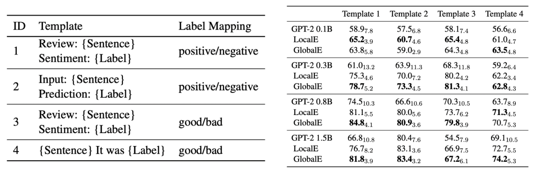 在不同的prompt模板下,本文方法是鲁棒的。 换用4种不同的线性化输入样本的模板(下图左),模型表现的提升是稳定且一致的(下图右)。