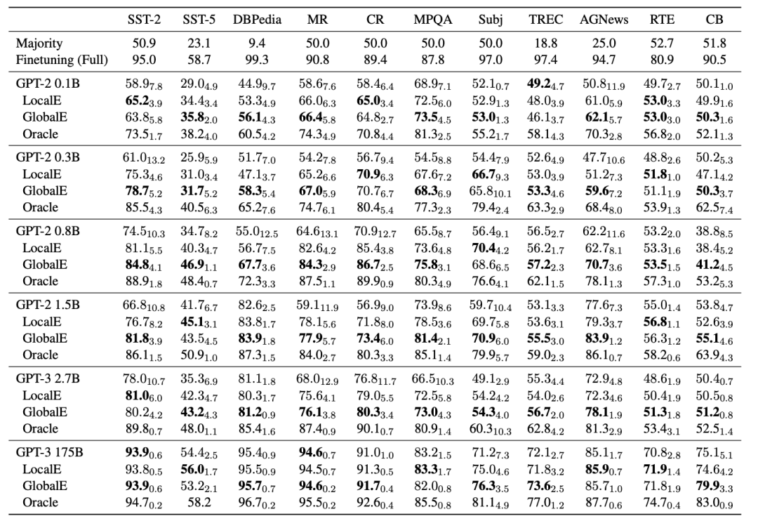 相对于不挑选prompt展示顺序的方法而言,使用GlobalE和LocalE的方法平均取得了13%与9.6%的提升。这表明,基于熵和无标注数据生成的选取方法是有效的。