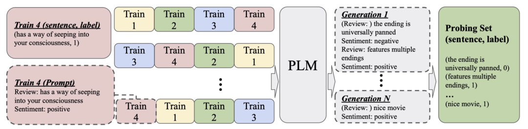 第一步是生成用来验证的无标注数据集 。作者简单地以每个prompt的顺序作为前缀,输入到预训练语言模型中,让模型解码出一系列的同分布数据。如下图所示。之所以使用预训练模型生成伪数据集,而非使用真实数据作为验证集,主要是出于少样本学习的考虑。