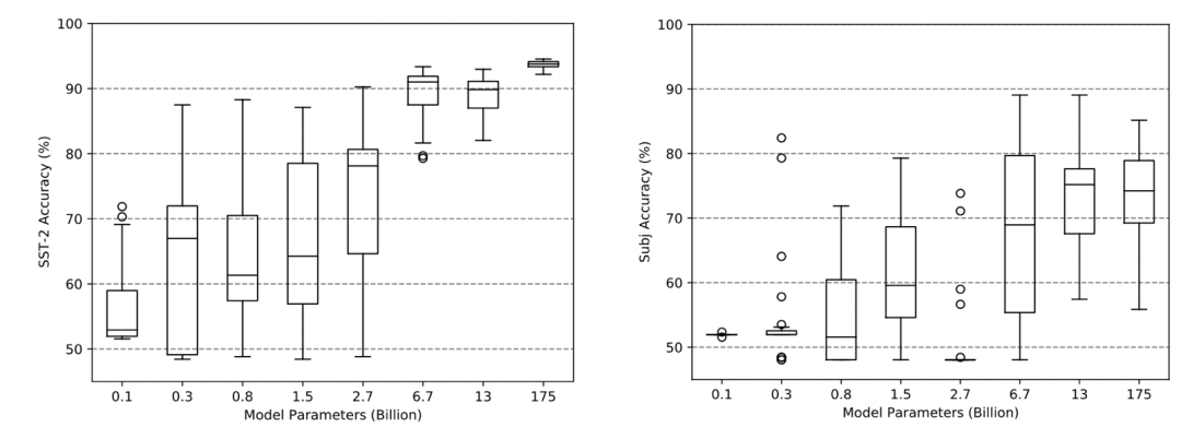 更大模型难以完全避免模型表现随prompt顺序变化的波动。 SST-2任务(上图左)中,貌似随着模型增大,波动变小了很多。但在subj任务中(上图右),即使是175B的GPT-3模型,表现依然会随着prompt的顺序有很大的波动。