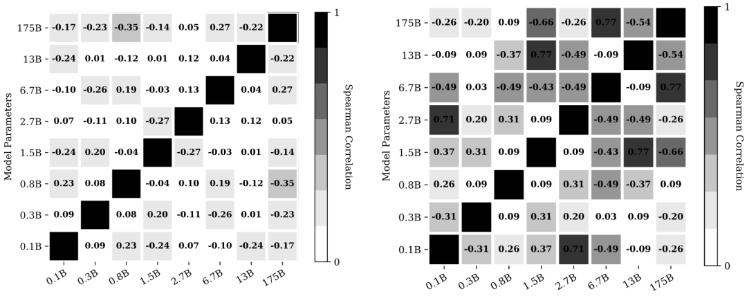 优质的展示样本的顺序,也没有什么明显的规律。 如果优质展示样本的顺序存在一定规律,那应该具有一定的可迁移性,即在不同模型下,性能都比较好。然而,这一规律并不存在。不同模型下优质的展示样本之间具有很大差异。下图显示的是不同展示样本顺序在不同模型的表现之间的斯皮尔曼秩相关系数。左图针对展示样本顺序(4!=24个),右图针对展示样本标签顺序(由于2正2负,一共有6种)。可以看出,不管是样本顺序,还是标签顺序,都不具备跨模型迁移能力。因此,优质的展示样本的顺序,也没有什么明显的规律。