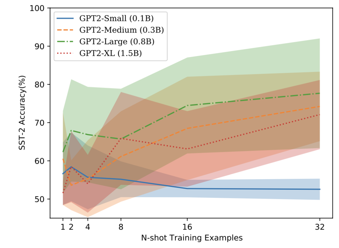更多的展示样本也无法缓解模型表现随prompt顺序变化的波动。 下图展示了4种规模的GPT-2模型,在1~32个展示样本时的波动范围。可以看到,随着展示样本量的增加,模型表现普遍有所提升,但波动范围并没有明显缩小。