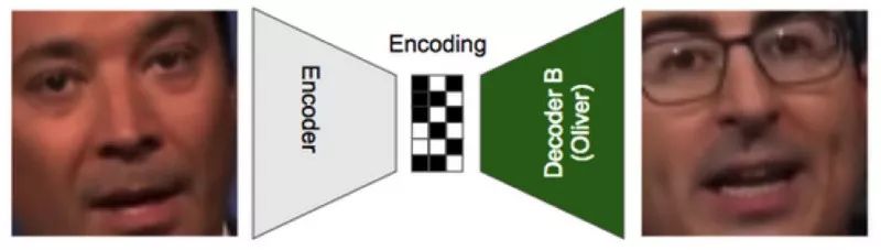 DeepFakes 让一个编码器把一个人脸压缩成一个代码和两个解码器,一个将其还原成人物 A(Fallon),另一个还原成人物 B(Oliver)。