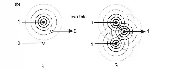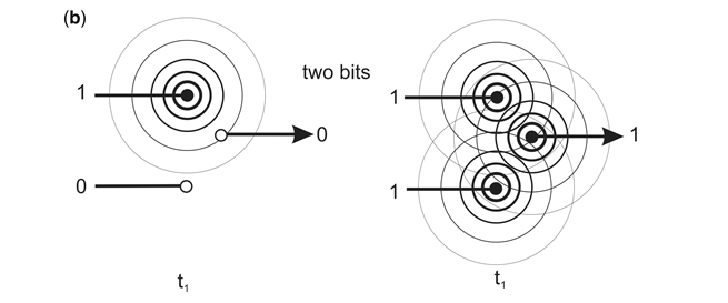 动态电磁场信息可以集成信息和功能作为一个逻辑门。「和」门显示为两个输入和一个输出,每一个都在t1时刻编码为0或1。输入是作为电磁场发射器的偶极子,在两种状态之间振荡,要么是发射(振荡对应于输入= 1),要么是不发射(不振荡,输入= 0)。输出是EMF接收器,它实现输出信号