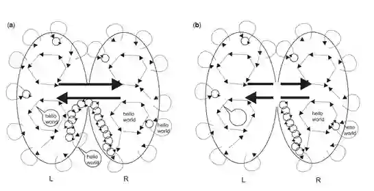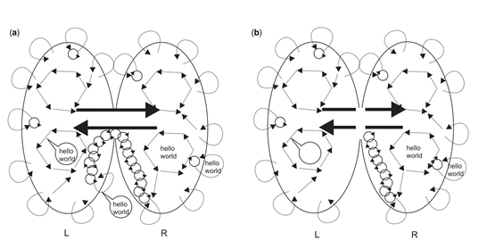 (a)通过让相邻的神经元参与振荡,同步激活的神经网络波——从而产生意识思想——可以在大脑中传播很远的距离,例如,从右脑到达左脑的言语中枢(言语泡)。这使得来自右脑的有意识的想法(「你好,世界」)可以通过语言与外界交流。与此相反,由于服从逆立方定律,电磁场扰动是高度局域的,因此不能远距离传输,除非由同步神经元组成的递归网络来加强。(b)切断「箭头」会阻止意识思想从右半球传递到左半球,因为它们不再能够通过神经振荡的循环网络通过胼胝体传递。