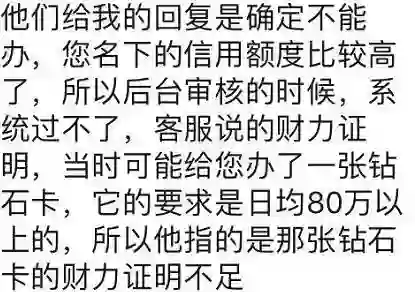 小红:我是系统退件,理财经理一会说可能是因为逾期(然而我没有)、一会说是负债和贷款超过了60万(我也没有),一会说是钻石卡的要求改成80万了,总之就是不批。