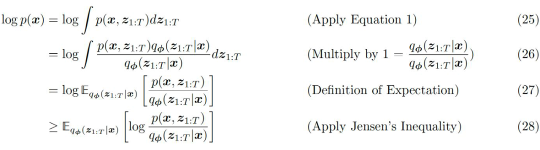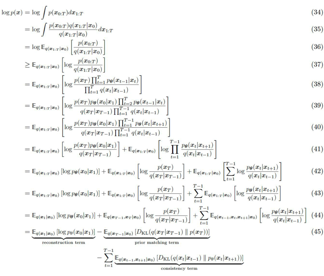而在将上面的公式 25-28 里的 Zt 与 Xt 替换后,我们可以得到 VDM 里证据下界的推导公式里的前四行,即公式 34-37。并且在此基础上,我们可以继续往下推导。