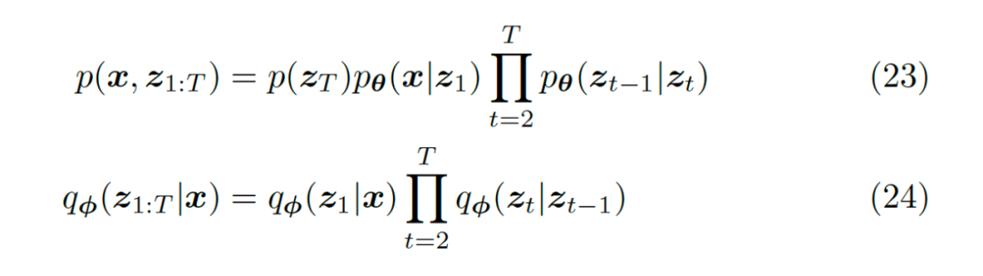 对于该 MHVAE,我们可以通过马尔可夫假设得到以下二式: