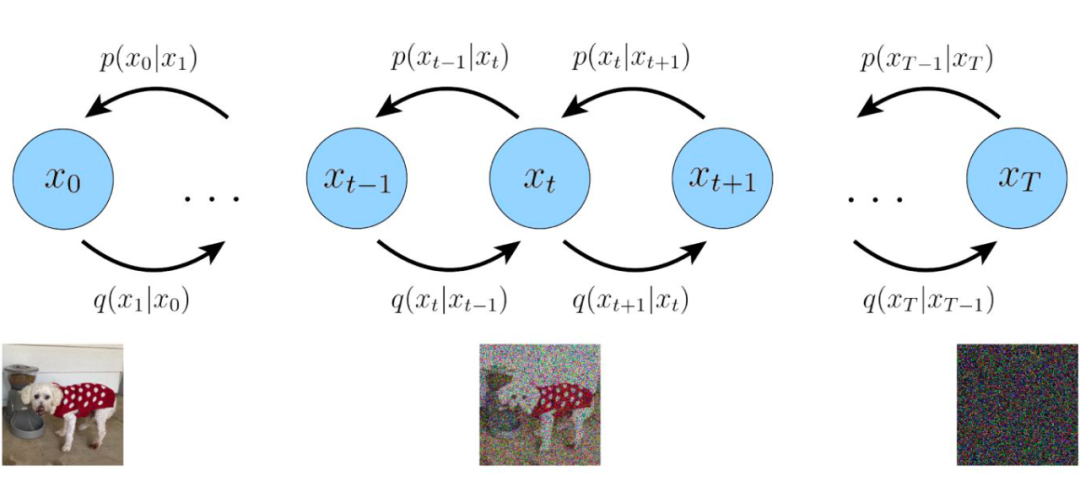 ▲ 扩散过程的直观解释:在数据x0上不断加高斯噪声直至退化为纯噪声图像Xt