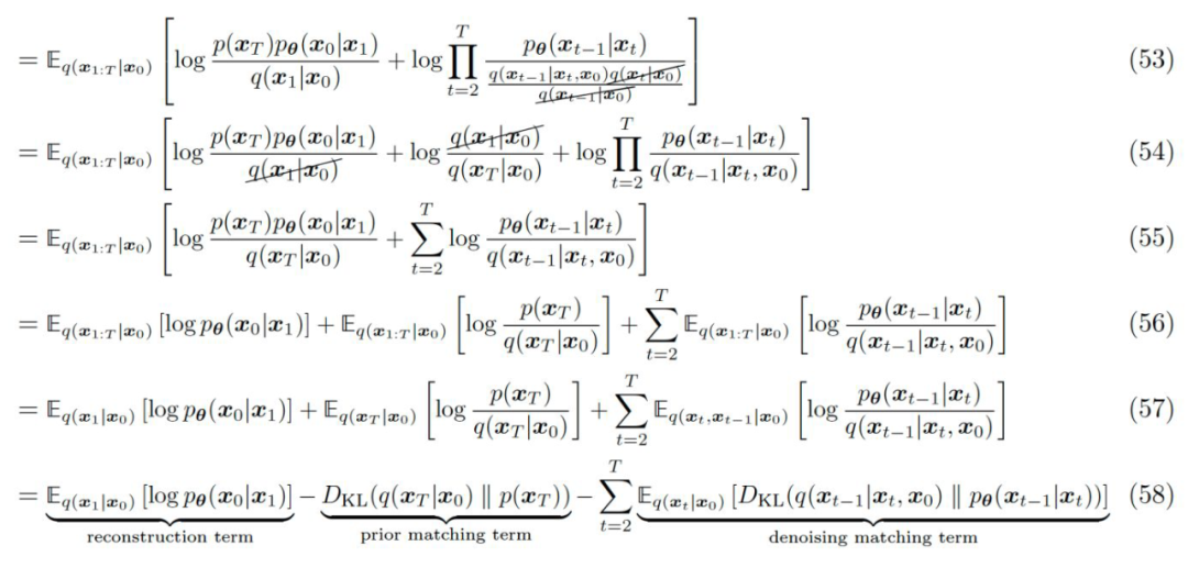 得到了式 55。式 56 用 log 的性质拆分重组了公式,式 57 如同前述式 43-44 的变换,省去了无关的时间步。式 58 则用了 KL 散度的性质。