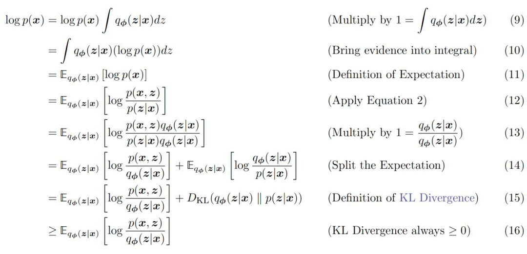引入了潜在向量后,我们可以将我们的目标分布的对数似然 logP(x),也称为“证据evidence”写成下列形式: