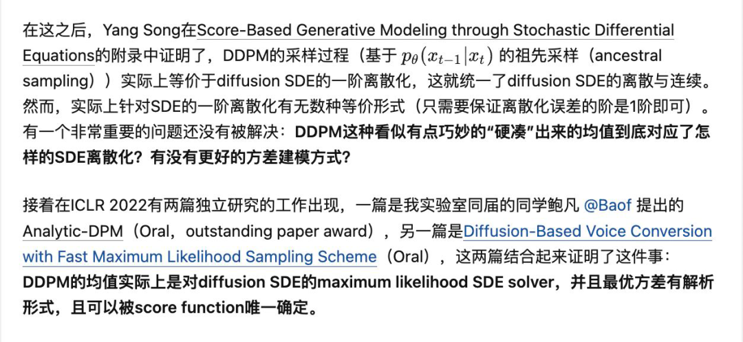 后续来自清华大学的基于将该 SDE 转化为常微分方程 ODE 后的采样提速论文,也获得了 ICLR 2022 的最佳论文奖!关于该论文的一些细节和直观理解,Song Yang 博士在他自己的博客里给出了非常精彩和直观的讲解。有兴趣的读者可以点开本文初始的第二个链接查看。以下只对大一统视角下的第三种视角做简短的概括。