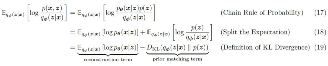 对该证据下界的变形的形式,我们可以直观地这么理解:证据下界等价于这么一个过程,我们用编码器将输入 x 编码为一个后验的潜在向量分布 q(z|x)。我们希望这个向量分布尽可能地和真实的潜在向量分布 p(z) 相似,所以用 KL 散度约束,这也可以避免学习到的后验分布 q(z|x) 坍塌成一个狄拉克 delta 函数(式 19 的右侧)。而得到的潜在向量我们用一个解码器重构出原数据,对应的是式 19 的左边 P(x|z)。