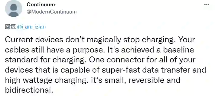 目前的设备仍然需要充电。你的充电线仍然有用。它实现了充电的基线标准。一个连接器适用于你所有的设备,能够实现超快的数据传输和高瓦特的充电。而且它体积小、可逆、双向。