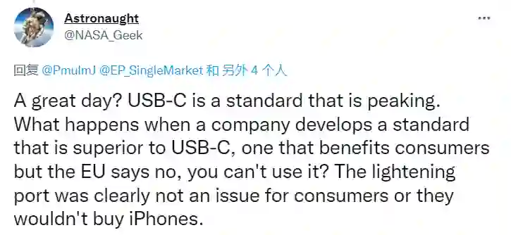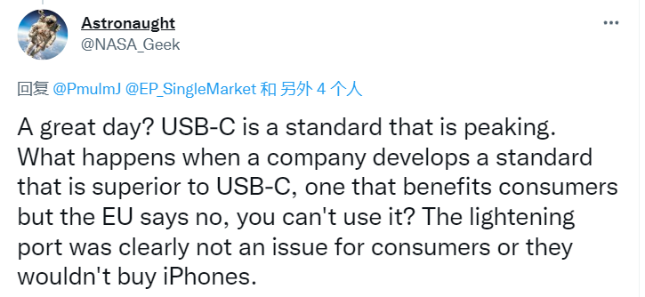 伟大的日子?USB Type-C是一个正在达到顶峰的标准。当一家公司开发出一个优于USB Type-C的标准,一个有利于消费者的标准,但欧盟却说不行,你不能用它,会发生什么?lighting接口对消费者来说显然不是一个问题,否则他们就不会购买iPhone。
