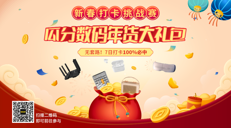 上 ZEALER 报名「新春打卡挑战赛」,打卡 5 天瓜分千元数码年货大礼包,打卡 7 天必中 ZEALER 专属定制礼物!祝大家虎年行大运!扫上方二维码或戳左下角「阅读原文」即可领走属于你的虎年礼物啦!