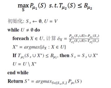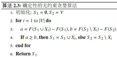 在这种情况下,我们给出一个确定性的贪婪算法。这个算法是这样:刚开始是空集,增加一个节点,这个节点增加的时候,加进来算一算增加量是多少。我们还要考虑假设在整个节点上,性能减掉多少。相比一下看是不是值得增加,如果增加量这个a比较大,那就加上去。我们同样的得到一个和它对应的是另外一个算法,这个算法是我们需要算一个a的增加量和b的减少量,到底我要不要接收这个S,要以一定的概率来考虑,怎么叫以一定的概率呢?我们对于一个给Y变量,让它服从均匀分布,如果这个均匀分布采样得到这个值小于这个东西把这个加进去,这是一个随机的算法。