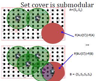 这个问题里的F是一个子模函数(我定义F是它覆盖的那个面积)。为什么呢?可以设想,我有两种情况,一种情况是我放2个传感器,还有一种情况是,我放4个传感器,其中包含了刚才的两个传感器。我在2和4个传感器的布局里,分别再加上同一个位置的1个传感器,那么你会发现上面小的集合情况(2个传感器)下带来的面积增加量比较大。而原来4个传感器的集合增加的面积部分比较小。这是一个非常直观的例子。